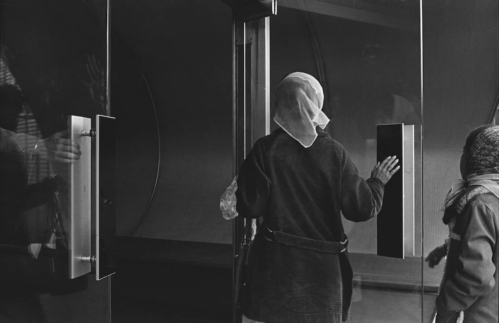 So I was waiting for a companion and took a seat on the bench which paralleled the flow of visitors in architect Gio Ponti’s ‘tube’ entrance. I always advised my students to avoid trying for pictures while sitting down, since mobility is a valuable asset for the photographer – the right place at the right time is hard to reach, feel, and choose while rooted on a bench. But if that’s a “rule,” here’s an exception. I was witness to a grand flow of in-and-out patrons from my perch as the rainy-day crowd came past me like migrating salmon past a bear’s favorite streamside outcrop. All I had to do was choose.